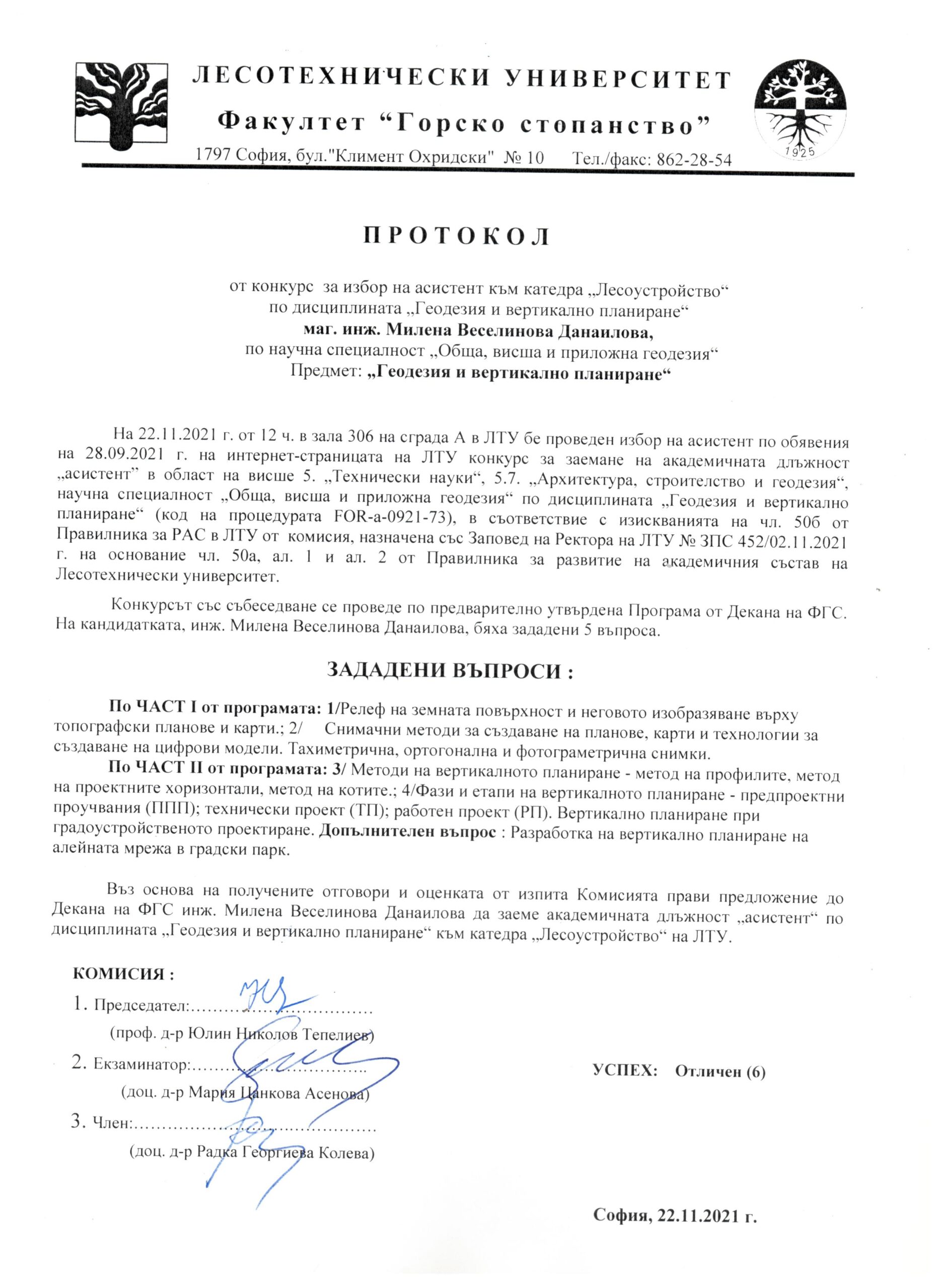 2021: 5. Технически науки, професионално направление 5.7. Архитектура, строителство и геодезия, научна специалност „Обща, висша и приложна геодезия” по учебна дисциплина „Геодезия и вертикално планиране“